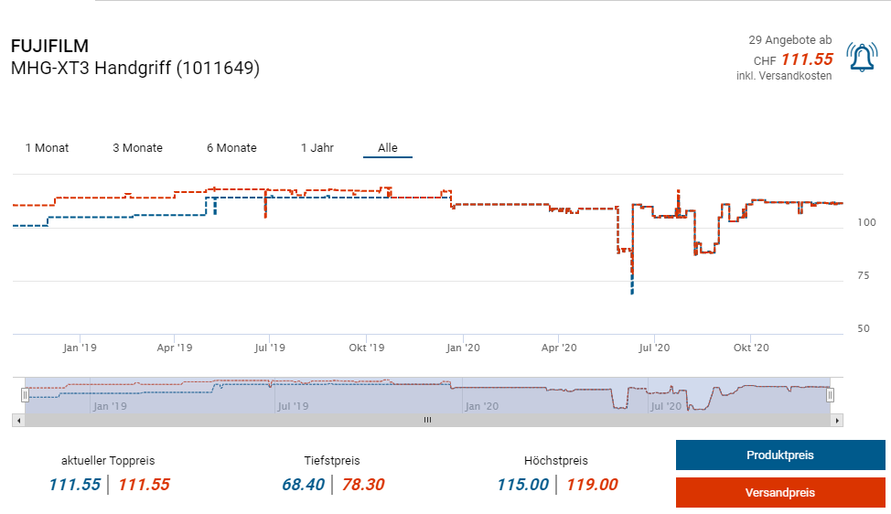 Bei Brack gibts gerade das Bundle aus Fujifilm X-T3 Kamera, XF16-80mm Objektiv sowie dem Griff MHG-XT3 zum Aktionspreis von 1299 Franken. Wenn man alles seperat zu aktuellen Tiefstpreisen kaufen würde käme man auf etwa 1553 Franken.