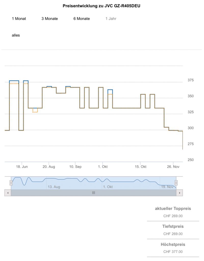 Gemäss toppreise war der bestprice über alle Farben bislang bei 298.90 CHF, was aktuell auch der zweitbeste Preis ist.