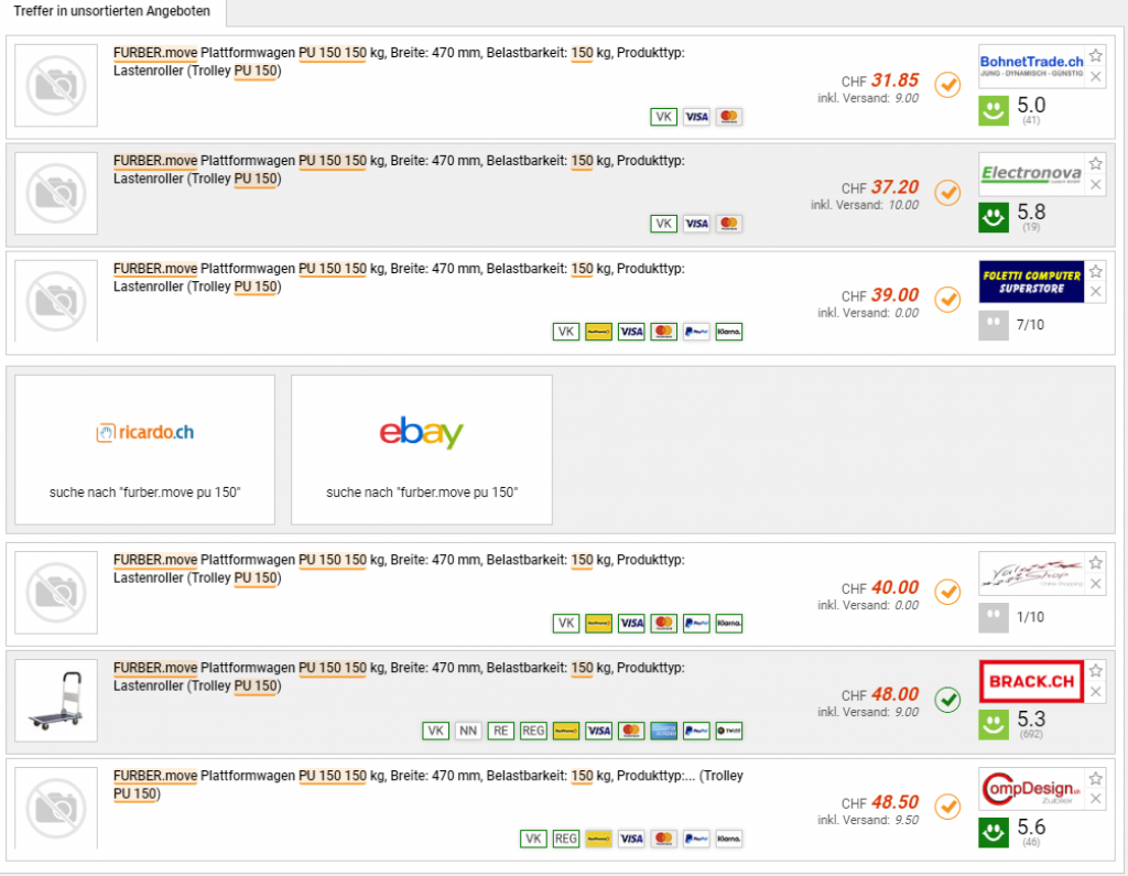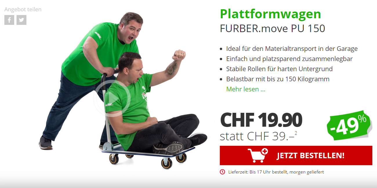 Bei DayDeal gibt es den Furber.move Plattformwagen für den Bestpreis von CHF 19.90. Leider ist keine Preiskurve vorhangen. Dennoch ist die Differenz zum zweitbesten Angebot recht hoch, denn das beträgt CHF 31.85.