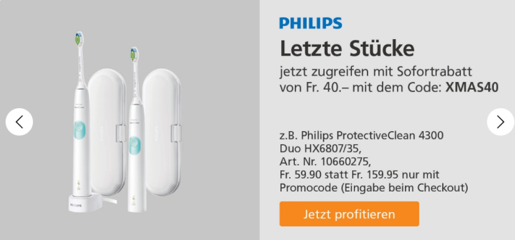 Wähle eine der Schallzahnbürsten aus der Produktliste. Zum Beispiel die ProtectiveClean 4300 Duo, welche aktuell für 99.95 statt 159.95 angeboten wird und mit dem Code bezahlst du nur noch 59.95! Der aktuelle Bestpreis liegt bei 93.90. Auch alle anderen Artikel sind mit dem Code weit unter Marktpreis, ein hammer Angebot! 🙂