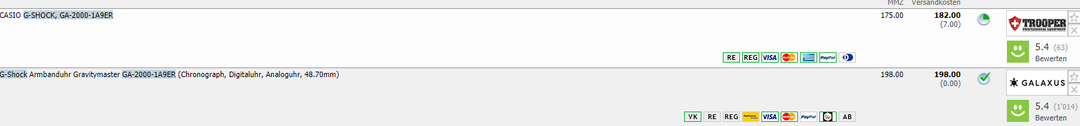 Das Tagesangebot von Galaxus ist heute die G-Shock Gravitymaster GA-2000-1A9ER (48.70mm) für CHF 129.-. Die Uhr gibt es nicht bei vielen Händlern, sodass es wenige Vergleichspreise und keine Preischart bei toppreise.ch gibt. Der beste Vergleichspreis liegt bei CHF 175.- (CHF 182.- mit Versand).