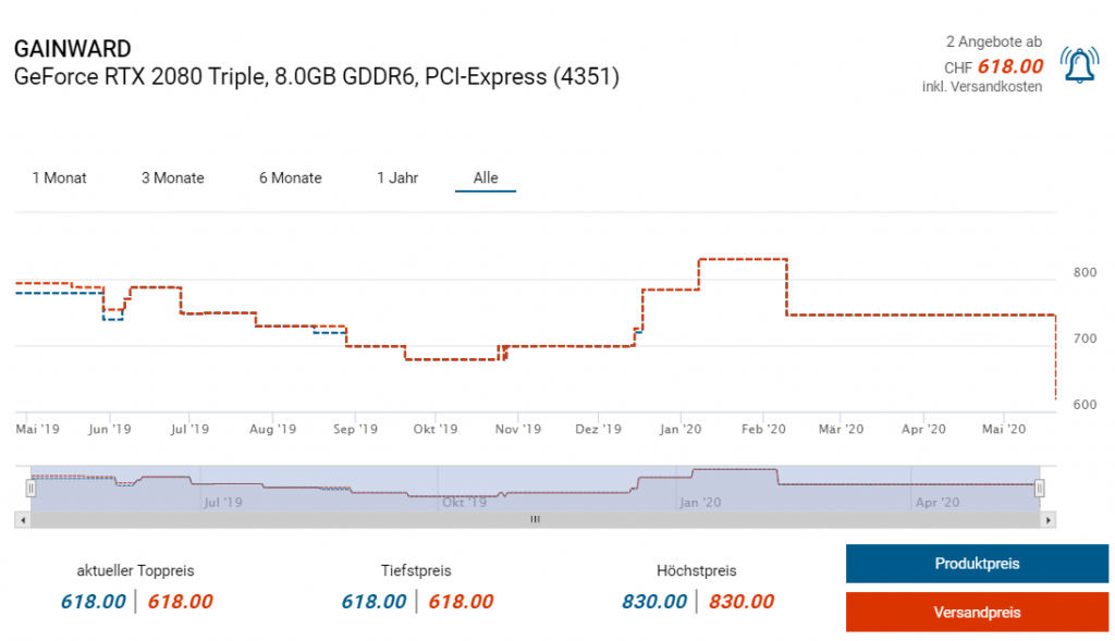 Bei digitec gibts die derzeit wohl günstigste RTX 2080 Grafikkarte, die man sich bestellen kann. Es ist zwar kein High-End-Modell das man einfach übertakten kann, es stellt aber dennoch ein gutes Angebot dar, da ich nicht einmal bei 700 Franken eine RTX 2080 finden konnte.
