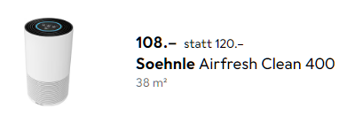 Momentan bekommt man bei Galaxus/Digitec den Soehnle Airfresh Clean 400 zum Preis von 87,40 statt 113 Franken inkl. Versandkosten laut Toppreise.