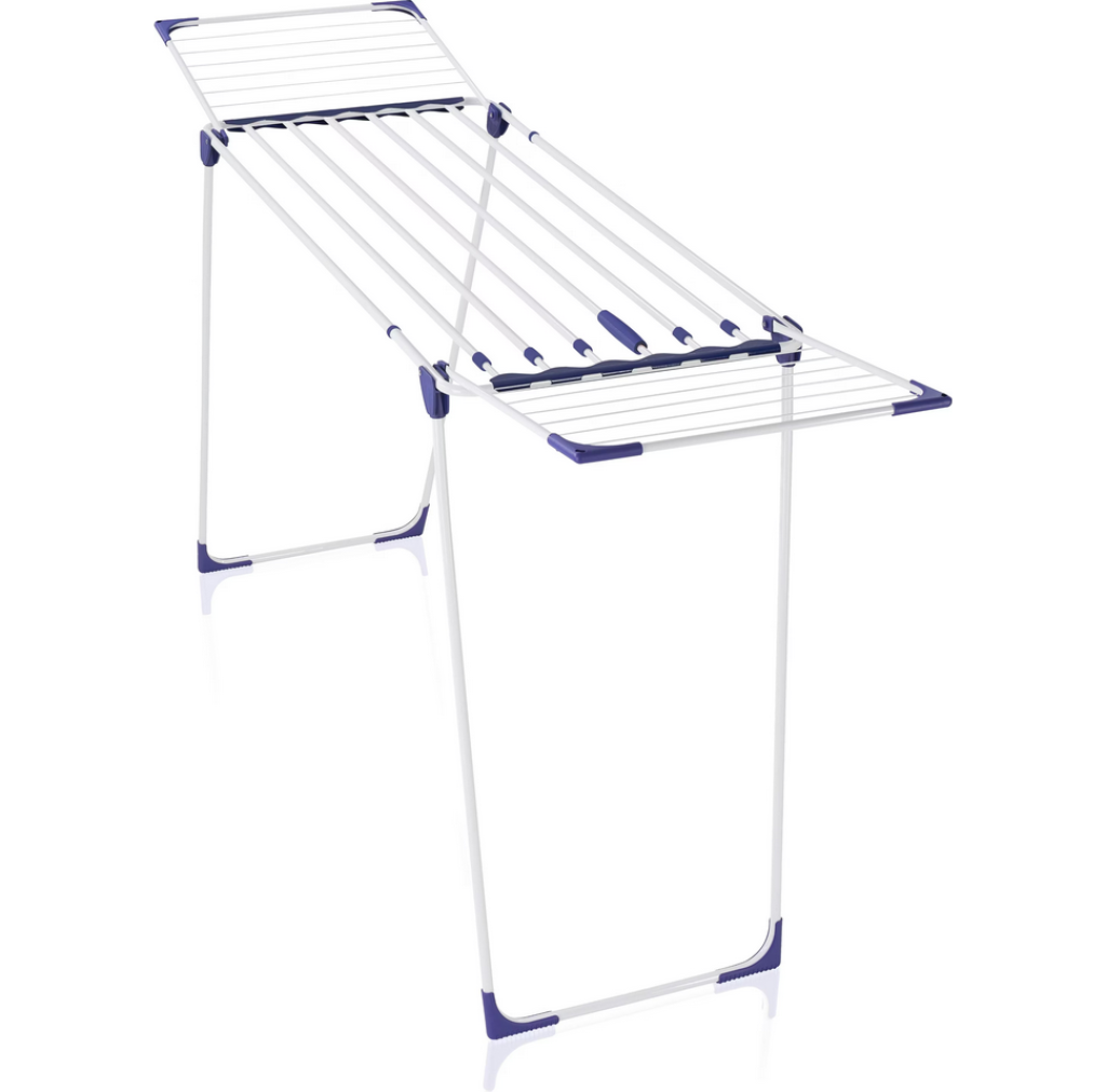 Der Leifheit Standtrockner Classic Extendable 230 Solid bietet XL-Trockenstäbe, die sich mit nur einem Handgriff variabel um stattliche 67 cm auseinanderziehen lassen – bis zu einer Breite von 184 cm: einfach perfekt zum Trocknen großer Wäschestücke. Besonders wäschefreundlich sind die extradicken Stäbe des flexiblen Standtrockners. Auf ihnen trocknet die Wäsche ganz ohne unschöne Abdrücke. XL-Komfort bietet auch die Höhe: Das Trockengitter ist 98 cm hoch, die Flügel 106,5 cm. So können selbst lange Wäschestücke wie Kleider, Nachthemden und Hosen aufgehangen werden, ohne den Boden zu berühren. Durch die mit extra breitem Abstand angeordneten Stäbe ist das Aufhängen der Wäsche einfacher und die Wäsche trocknet schneller. Auch in Sachen Stabilität punktet der Standtrockner. Dafür sorgen neben den XL-Stäben vor allem die soliden Gelenke, die sichere Klick-Arretierung und das sehr stabile, U-förmige Untergestell. Als Extra besitzt der Classic Extendable 230 Solid vier windsichere Kleiderbügelhalter zum Trocknen von Blusen und Hemden. Ausgezogen und mit ausgeklappten Seitenteilen bietet der Trockner eine Trockenlänge von maximal 23 Metern und damit Platz für zwei Waschmaschinenfüllungen. Trotz seiner hohen Trockenlänge lässt sich der Standtrockner platzsparend zusammenklappen und somit gut verstauen.
