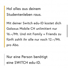 Falls ihr einen Studenten mit einer Switch edu-ID kennt, kann diese Person ein Galaxus mobile CH unlimitiert abo (Normalpreis CHF 19.-) abschliessen und vier weitere Personen einladen, um das abo zu teilen. Durch den Friend+Family Rabatt zahlt jeder CHF 4.- weniger. Falls der Sudent der Hauptvertragshalter ist, profitieren auch alle von dem Studentenrabatt. So resultiert ein Preis von CHF 12.-
