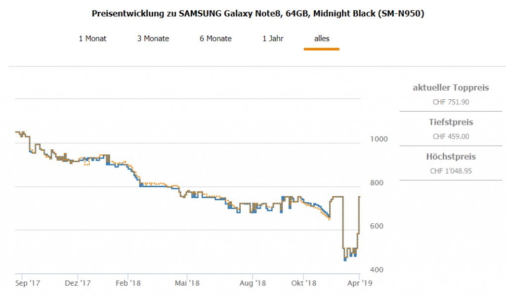 Bei DeinDeal gibt’s das Samsung Galaxy Note8 derzeit für CHF 450.90 inkl. Lieferung. Bestpreis laut toppreise war (ohne Lieferung) für CHF 459.- Momentan wird auf toppreise als zweitbesten Preis CHF 751.90 angezeigt, digitec hat das Device aber für CHF 469.- im Sale.