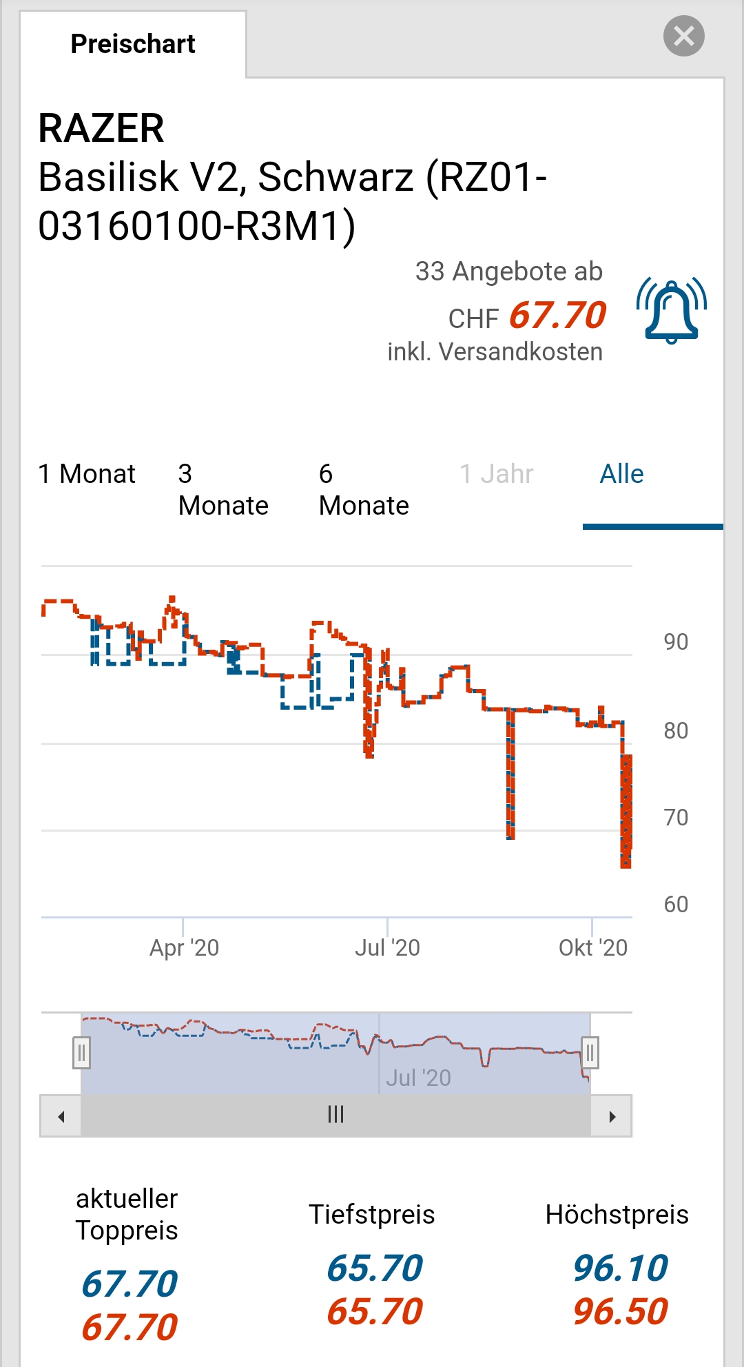 Bei Amazon Grossbritannien gibts derzeit die Gaming-Maus Basilisk V2 mir 20’000 DPI-Sensor zum Aktionspreis von knapp 57 Franken. In der Schweiz starten die Preise sonst ab CHF 67.70.