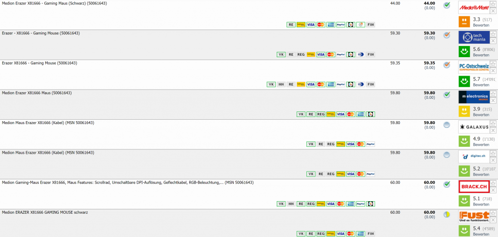 Bei MediaMarkt gibt’s gerade die Gaming-Maus Medion Erazer X81666 zum neuen Bestpreis von CHF 44.- Zweitbester Preis beträgt CHF 59.30 Vorheriger Bestpreis scheint bei gut 50 Franken gelegen zu haben.