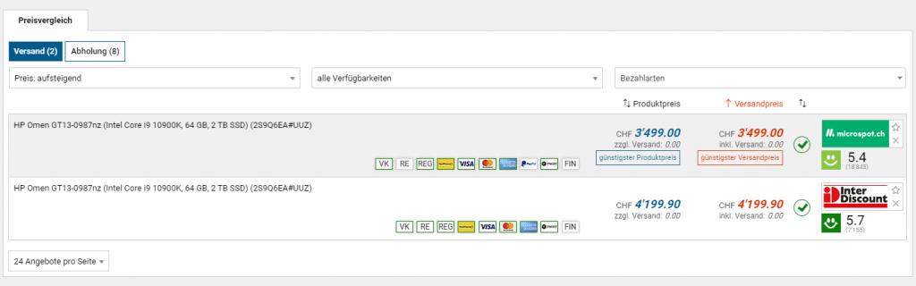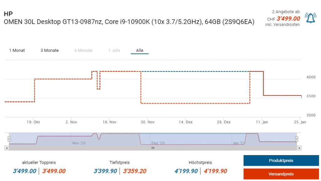 Bei microspot gibts derzeit den Highend-Gaming-PC mit RTX 3090 Grafikkarte zum Aktionspreis von CHF 3499.- Laut toppreise bietet lediglich ein weiterer Händler die gleiche Konfig. an. nämlich Interdiscount für CHF 4199.90. Bei der Konfiguration mit 1TB grosser SSD gibts den PC zum Beispiel aber auch erst ab fast 3800 Franken. Ich glaube vor wenigen Wochen ein etwas besseres Angebot bei Daydeal gesehen zu haben, bin mir aber nicht sicher obs die gleichen Specs hatte.