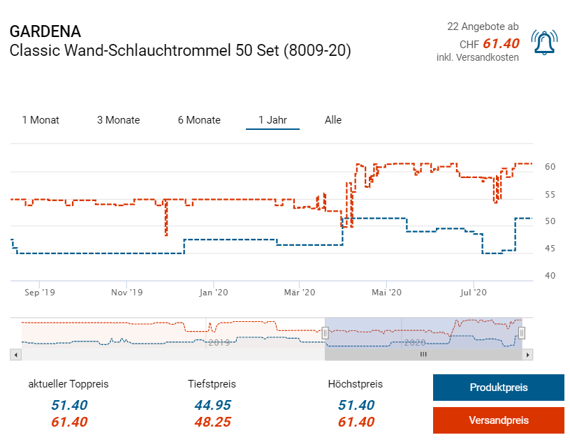 Bei Amazon gibts gerade das Wand-Schlauchtrommel 50 Set für den Garten zum Aktionspreis von 48 Franken. Laut toppreise verlangt der zweitgünstigste Schweizer Händler derzeit CHF 61.40, der Bestpreis soll Anfang Jahr bei ca. 48 Franken gelegen haben.