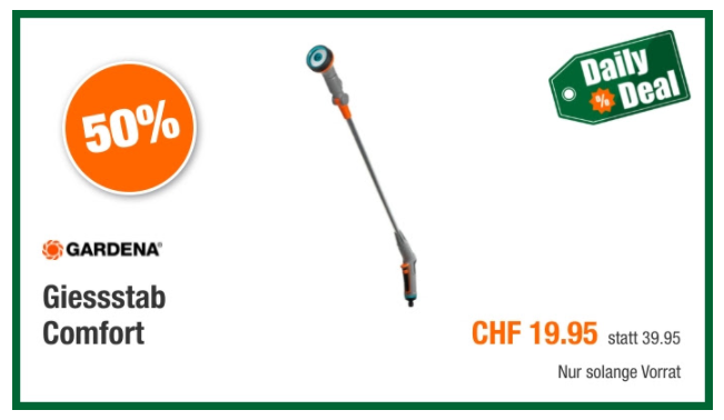 Bei Migros Do It + Garden gibt es heute den Gardena Comfort Giessstab im Daily Deal für CHF 19.95. Der vorherige Bestpreis war CHF 21.20. Der zweitbeste Preis beträgt CHF 34.20.