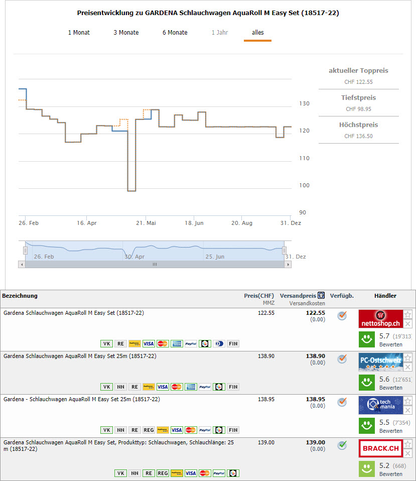 Wenn man aus dem Fenster schaut, ist der Frühling / Sommer zwar noch etwas entfernt aber momentan gibt es bei Galaxus den Gardena Schlauchwagen AquaRoll M Easy Set E3 / 25m (Hersteller-Nr. 18517-22) zum Tiefstpreis von CHF 50.10 im Sale und die wärmeren Temperaturen kommen bestimmt auch wieder 😉