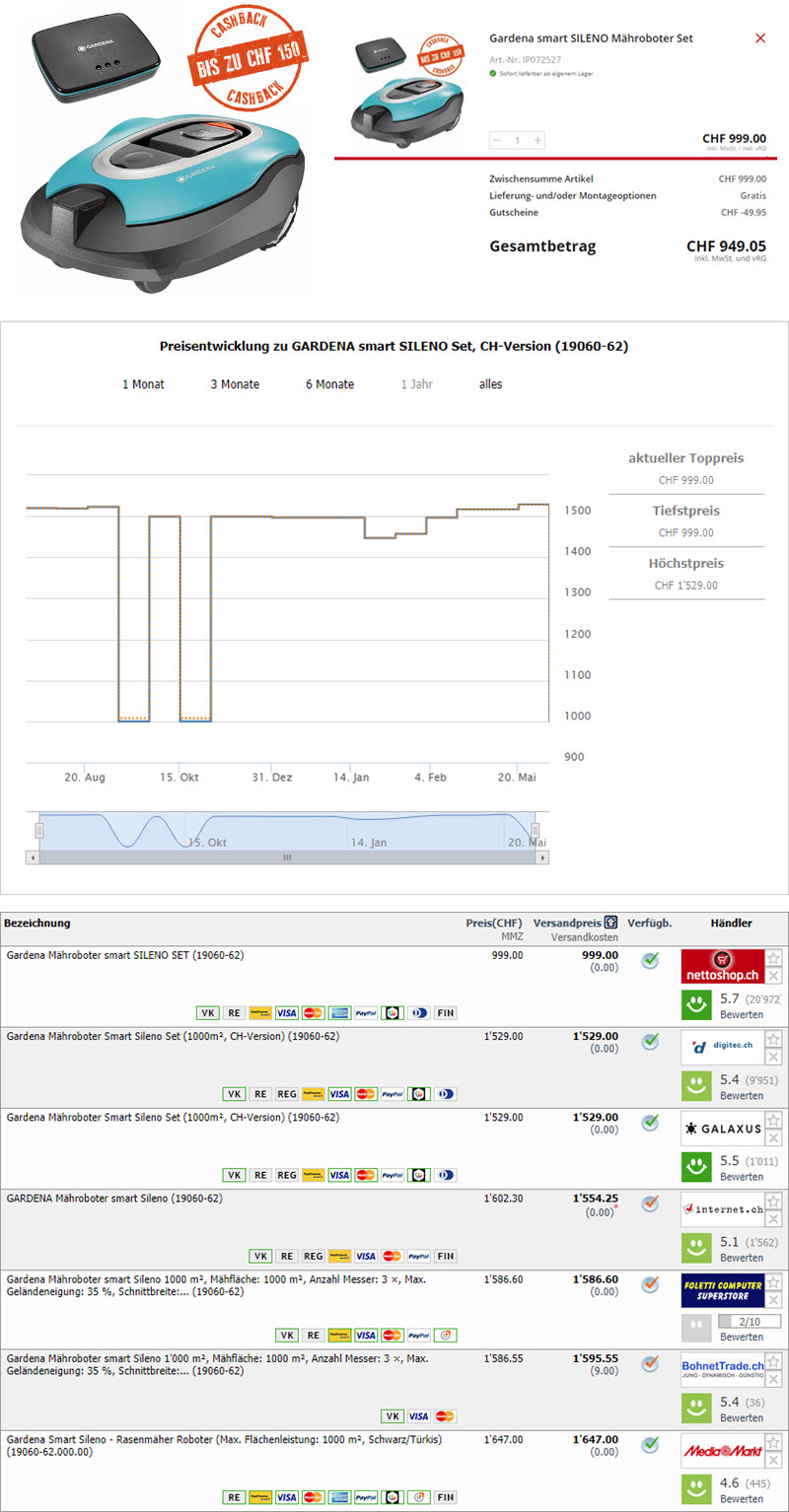 Bei Nettoshop gibt es momentan das Gardena smart SILENO Mähroboter Set (HerstellerNr. 19060-62) zum Bestpreis von CHF 799.05.- wenn ihr beim Checkout den 5% Rabattcode PBW-5-1903 verwendet und nach dem Kauf zusätzlich von der aktuell laufenden Gardena Cashback Promo (= CHF 150.- auf diesem Modell) profitiert (Gerätepreis CHF 949.05 minus CHF 150.- Cashback = CHF 799.05). Weitere Details finden sich hier.