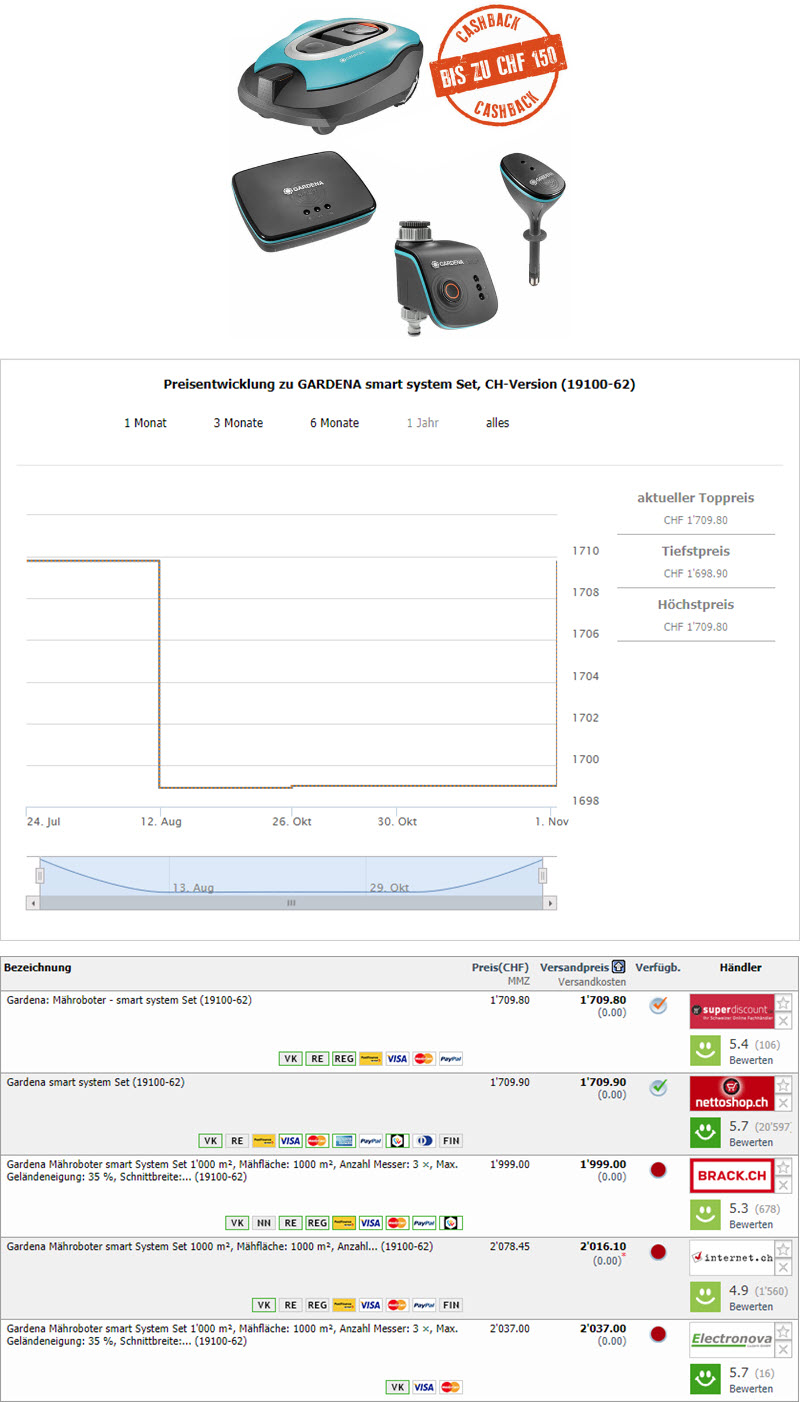 Bei Daydeal gibt es im Wochendeal das GARDENA smart System Set (ArtikelNr. 19100-62) zum absoluten Bestpreis von CHF 1149.- wenn ihr nach dem Kauf (Preis CHF 1299.-) zusätzlich von der aktuell laufenden Gardena Cashback Promo (= CHF 150.- auf diesem Modell) profitiert. Weitere Details finden sich hier.
