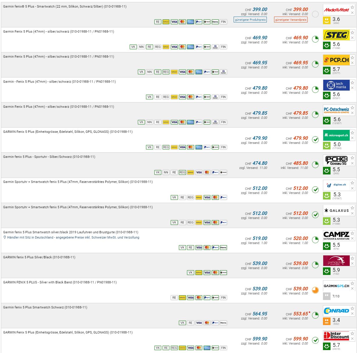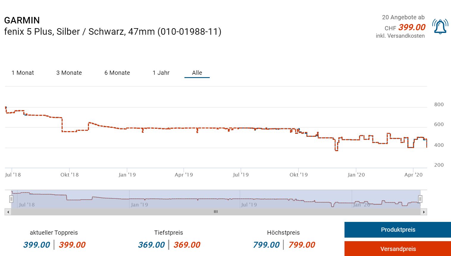 Bei Mediamarkt gibt es die Garmin fenix 5 Plus (Silber / Schwarz, 47mm) zum Bestpreis von CHF 399.- in Aktion. Zweitbester Preis ist CHF 469.90 bei STEG. CHF 369.- war der allzeitige Tiefstpreis.