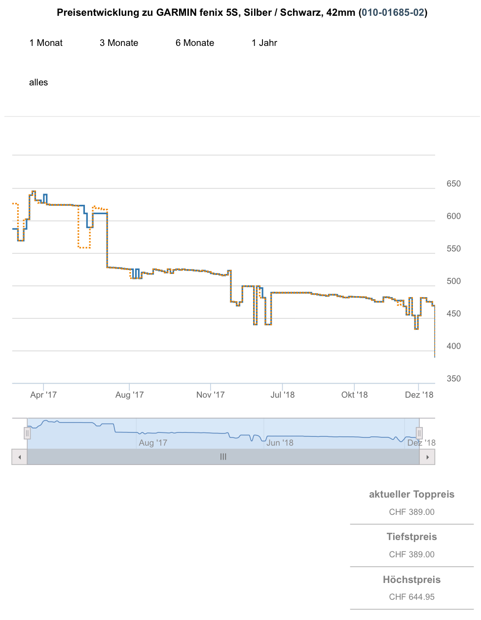 Bei digitec gibt es aktuell die GARMIN fenix 5S, Silber / Schwarz, 42mm für 389.- CHF.