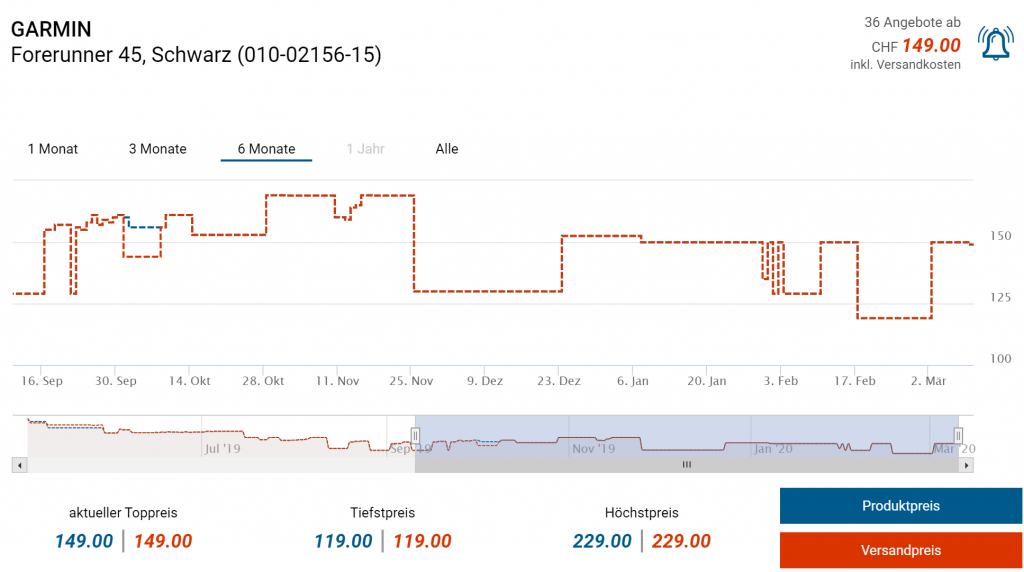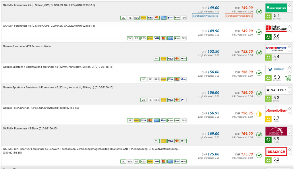 Bei Ochsner Sport in Aktion gibt’s die Garmin Forerunner 45 Large für CHF 139.90. Meldet man sich zum Newsletter an (ganz unten auf der Ochsner Sport Website), gibt’s noch einen 20.- Gutschein obendrauf. So bezahlt man noch CHF 119.90
