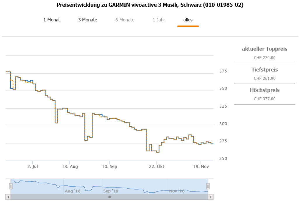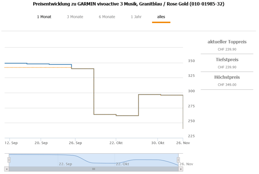 Bestprice nach Gutscheinabzug über beide Farbvarianten waren bislang 243.90 CHF, der zweitbeste Preis aktuell liegt bei 274.- CHF.