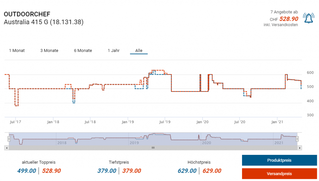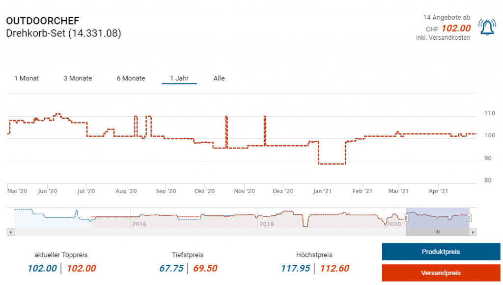 Zweitbester Preis für den Grill liegt derzeit bei CHF 528.90, der Drehkorb kostet seinerseits zurzeit 102 Franken, macht zusammen CHF 630.90 als Vergleichspreis.