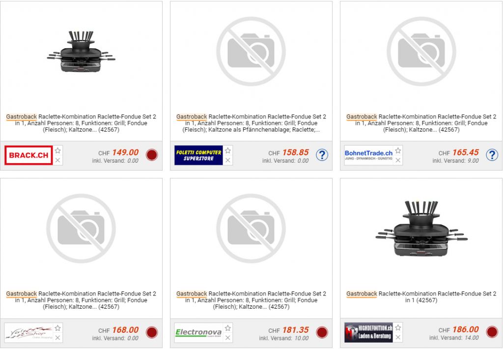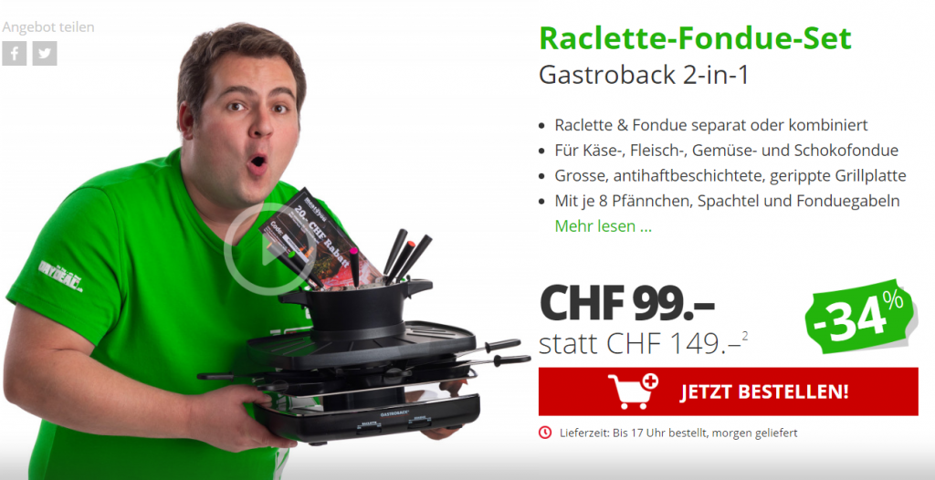 Bei DayDeal gibt es das Gastroback 2-in-1 Raclette und Fondue Set für den Bestpreis von CHF 99.-. Einen Preisverlauf gibt es nicht, aber der zweitbeste Preis beträgt CHF 149.- bei Brack.