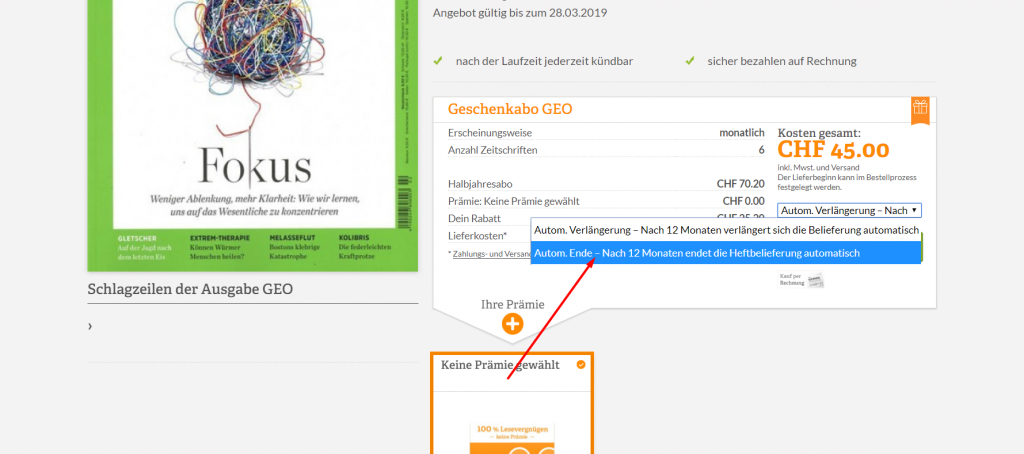 Das Abo endet automatisch, wenn man die Option Geschenkabo anwählt: