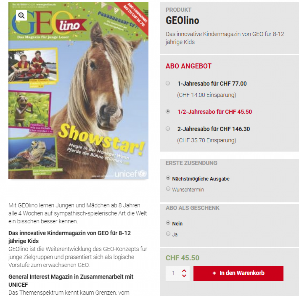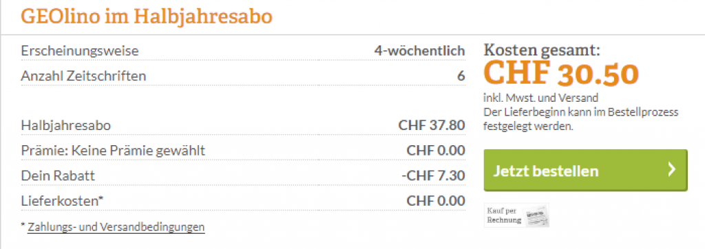 Momentan bekommt man bei Abo-Direkt die Geolino-Zeitschrift für 6 Monate für CHF 30.50, zusätzlich gibt’s 7.50 Rabatt mit dem Gutscheincode shopping-freude-ch. In 6 Monate erhält man 6 Zeitschriften, die sogar kostenlos geliefert werden. Nach den 6 Monaten muss das Abo jedoch gekündigt werden, ansonsten läuft es weiter zum vollen Preis. Das zweitbeste Abo-Angebot leigt bei CHF 45.50.