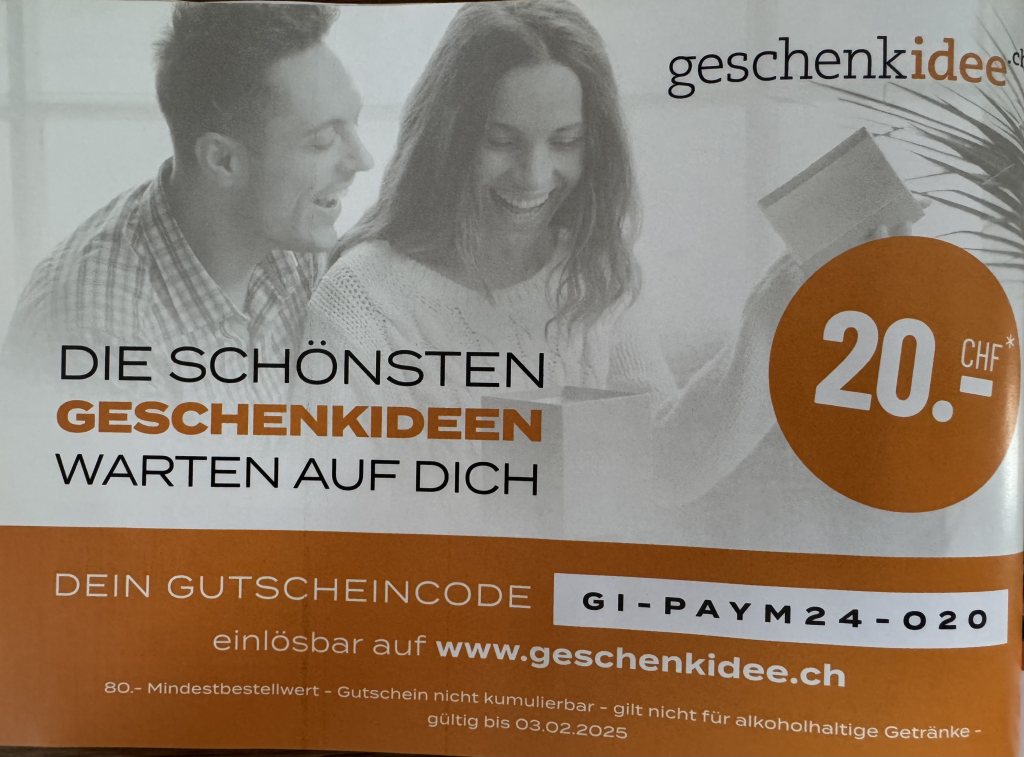 CHF 80 - Mindestbestellwert - Gutschein nicht kumulierbar - gilt nicht für alkoholhaltige Getränke - gültig bis 03.02.2025