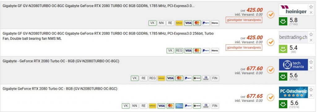 Bei Foletti Computer sogar noch günstiger! Eine RTX2080 für nur 389.45 CHF! Sicherlich ein Preisfehler! :-)
