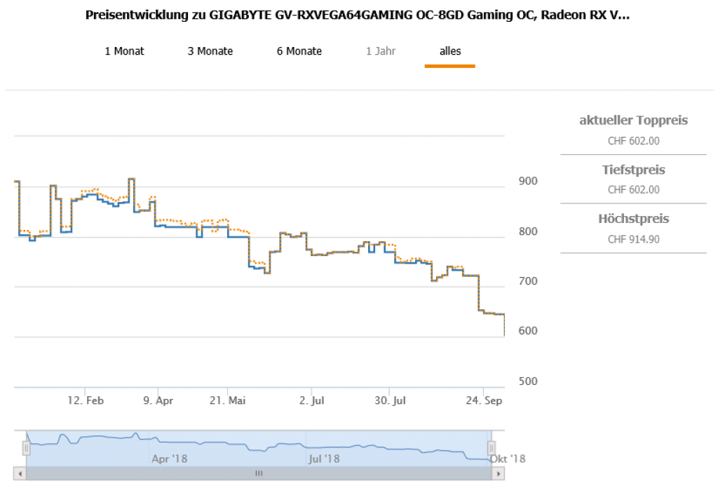 Bei digitec gibt es aktuell die GIGABYTE GV-RXVEGA64GAMING OC-8GD Gaming OC, Radeon RX Vega 64, 8.0GB HBM2, PCI-Express Grafikkarte für 602.- CHF.