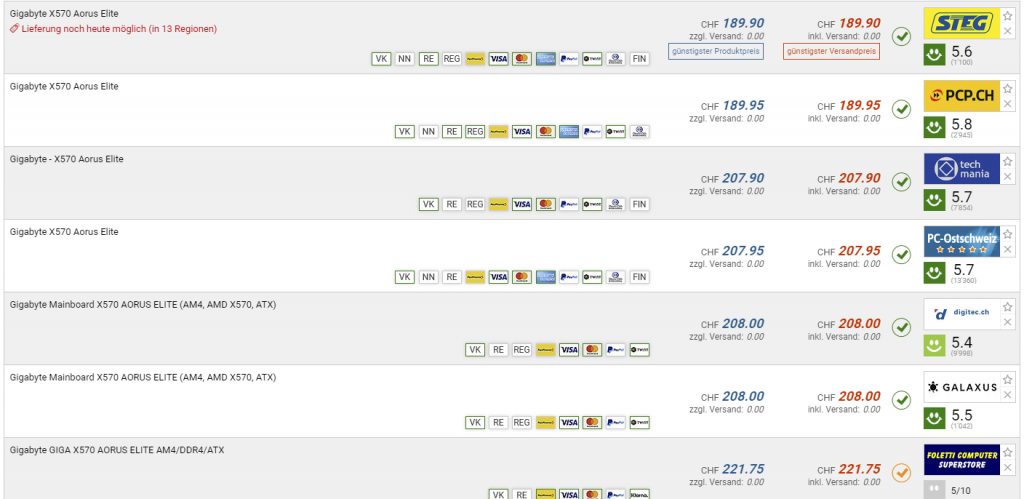 Bei Steg gibt es das Gigabyte X570 Aorus Elite Mainboard zu dem neuen Bestpreis von CHF 189.90. Der vorherige Bestpreis und auch der zweitbeste Preis liegt bei CHF 207.95. Der Schwester-Shop PCP.ch bietet das Mainboard für den gleichen Preis an.