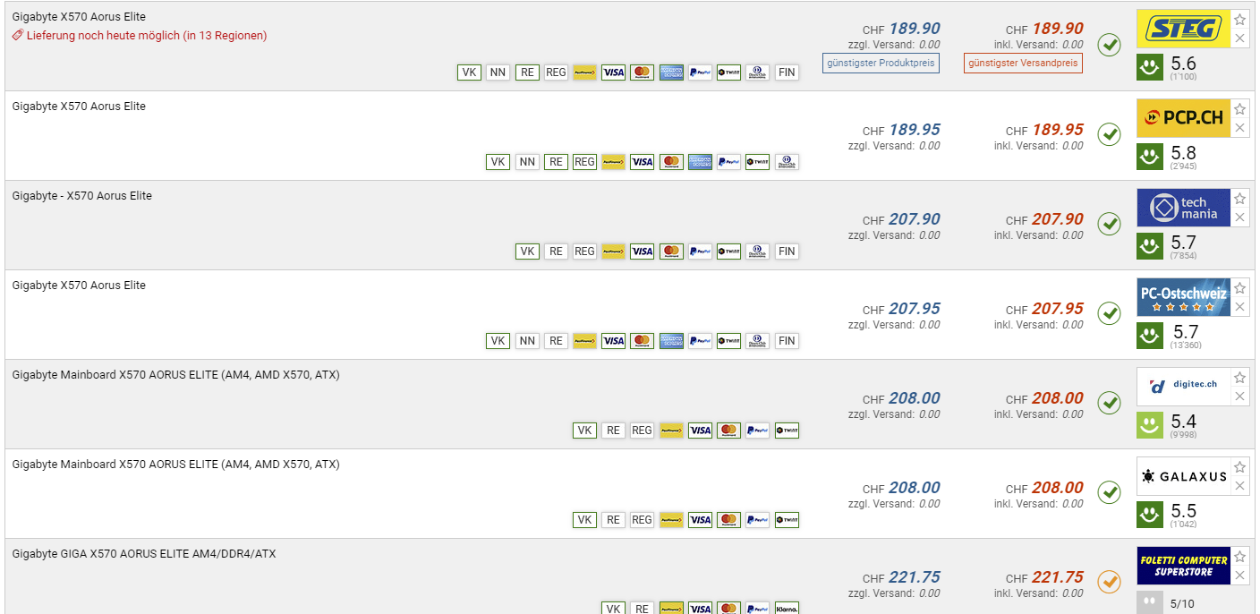Bei Steg gibt es das Gigabyte X570 Aorus Elite Mainboard zu dem neuen Bestpreis von CHF 189.90. Der vorherige Bestpreis und auch der zweitbeste Preis liegt bei CHF 207.95. Der Schwester-Shop PCP.ch bietet das Mainboard für den gleichen Preis an.