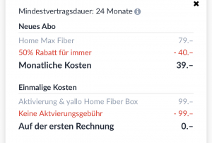 Zu beachten gilt, dass die Mindestvertragsdauer 24 Monate beträgt. Ausserdem kommen noch Aktivierungsgebühren in der Höhe von 99 Franken dazu.