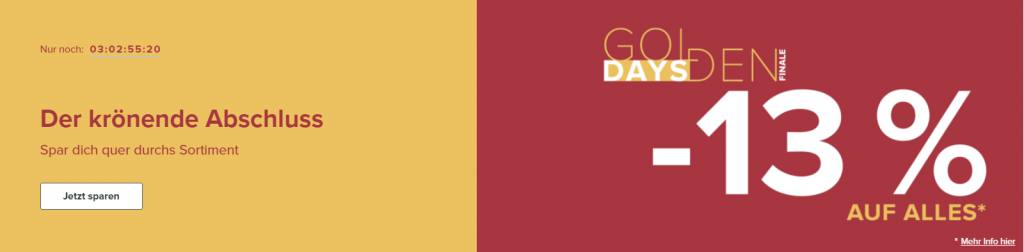 Nur noch für kurze Zeit bietet home24 gute Deals zu den Golden Days an. Momentan bekommt man mit dem Gutscheincode GOLDEN-DE-13 einen Rabatt von -13% auf das gesamte Sortiment.