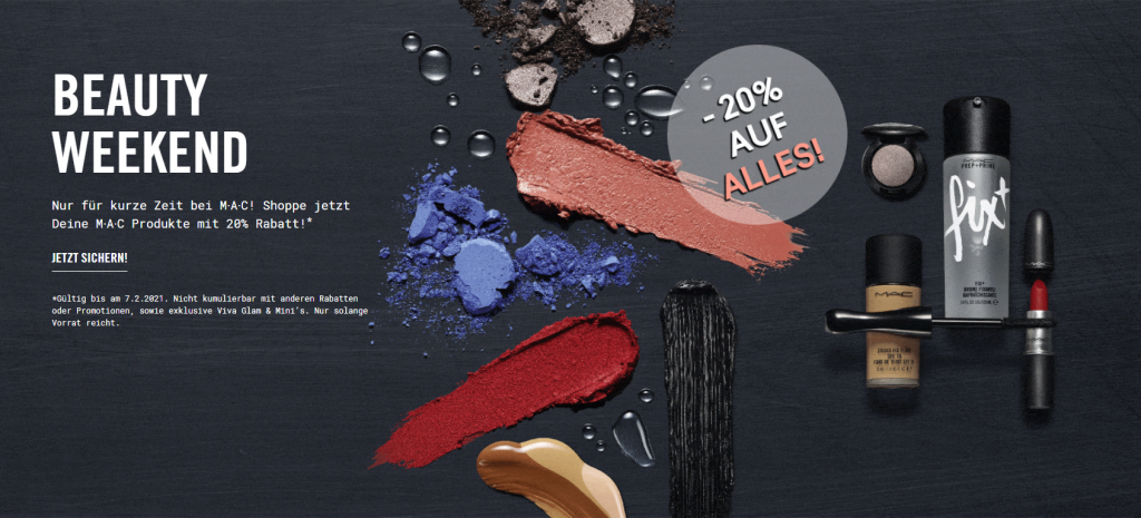 Im Beauty Weekend Sale gibts zudem 20% Rabatt auf Alles, Nicht kumulierbar mit anderen Rabatten oder Promotionen, sowie exklusive Viva Glam & Mini’s. Nur solange Vorrat reicht.
