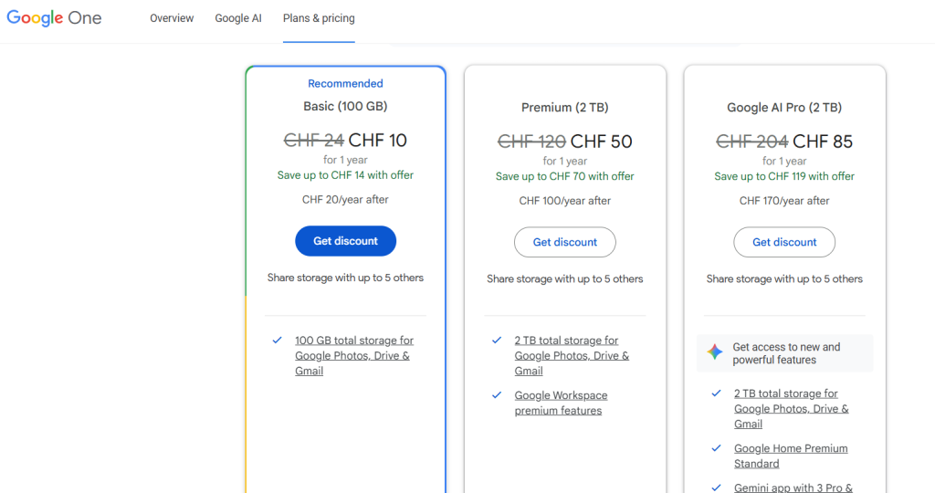 100 GB „Basic“-Speicher für nur 10 CHF im ersten Jahr statt 24 CHF, oder gleich 2 TB „Premium“ für 50 CHF bzw. 2 TB mit „Google AI Pro“ für 85 CHF – alle Pläne gelten für ein Jahr und können mit bis zu 5 weiteren Personen geteilt werden.
