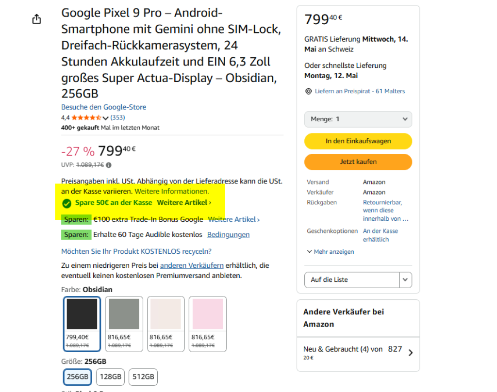 Das Google Pixel 9 Pro mit 256 GB in der Farbe Obsidian gibt es bei Amazon zum Bestpreis von umgerechnet ca. 695.20 Franken. Damit ihr auf den Preis kommt, müsst ihr einfach den Coupon aktivieren. Der aktuelle Verkaufspreis liegt bei 781.– Franken.