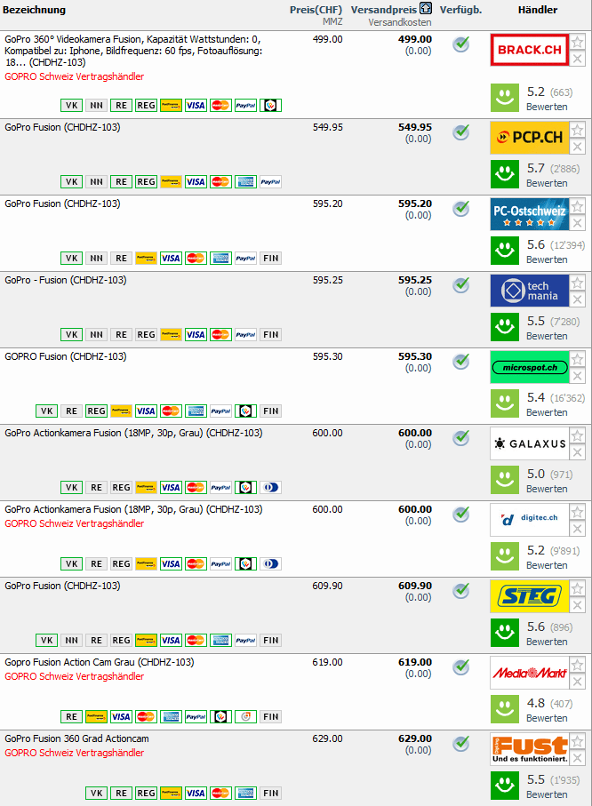 Bei brack gibt es aktuell die GOPRO Fusion für 499.- CHF.