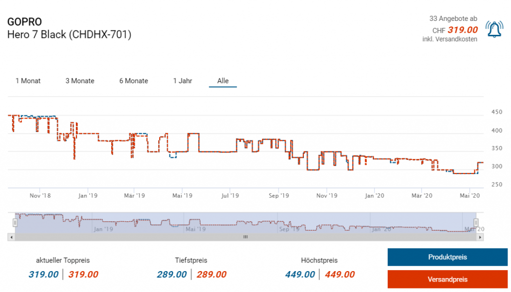Vertraut dem Preisgraphen daher auch nicht allzu fest, die Kamera gabs mehrfach unter 290 Franken.