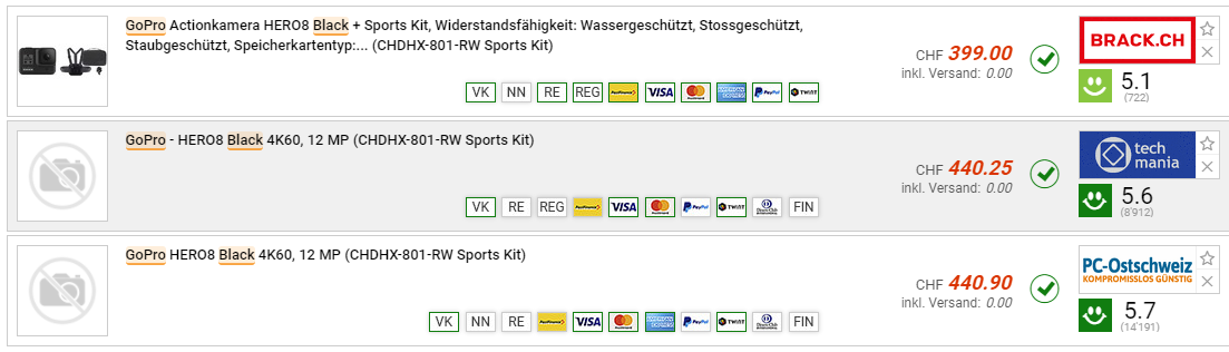 Bei DayDeal gibt es die GoPro HERO7 Black mit Sport-Kit für den Bestpreis von CHF 279.-. Der zweitbeste Preis für das Set liegt bei CHF 399.-. Wenn man sich beides einzeln für den Bestpreis kauft, liegt man bei ungefähr CHF 340.-.