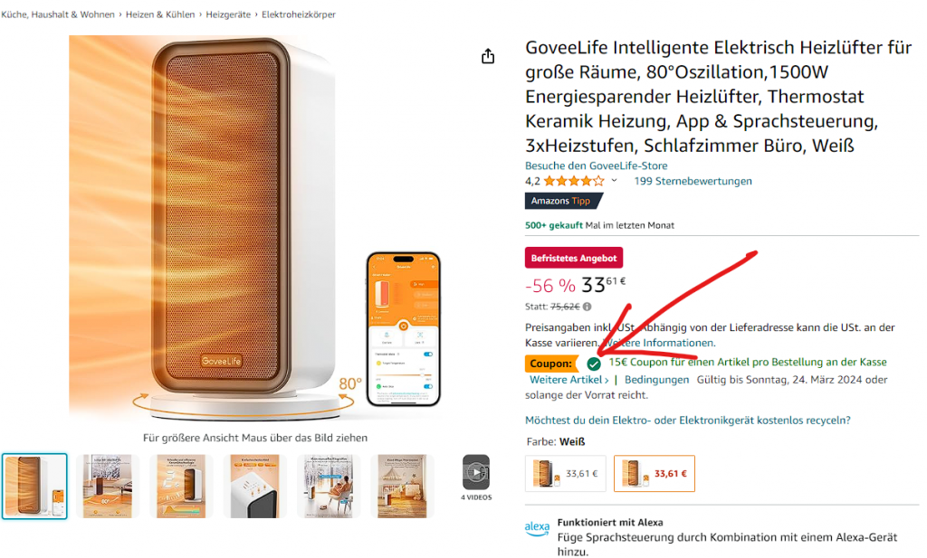 Bei Amazon gibt es aktuell den GoveeLife Intelligenter Elektrischer Heizlüfter inkl. Versand zum Aktionspreis von CHF 24.66 zu kaufen. Es werden noch CHF 6.73 Versandkosten verrechnet. Bitte nicht vergessen den, 15 Euro Gutschein auf der Produktseite einzulösen.