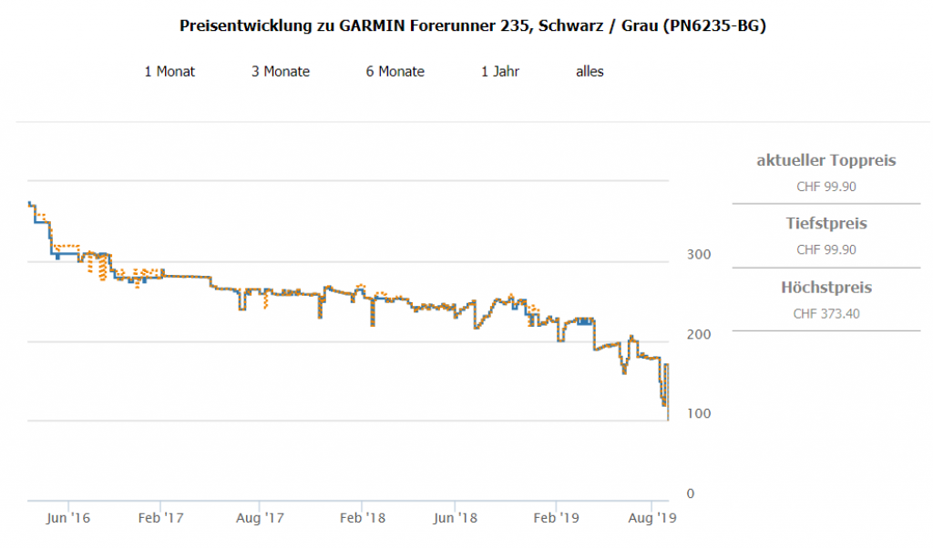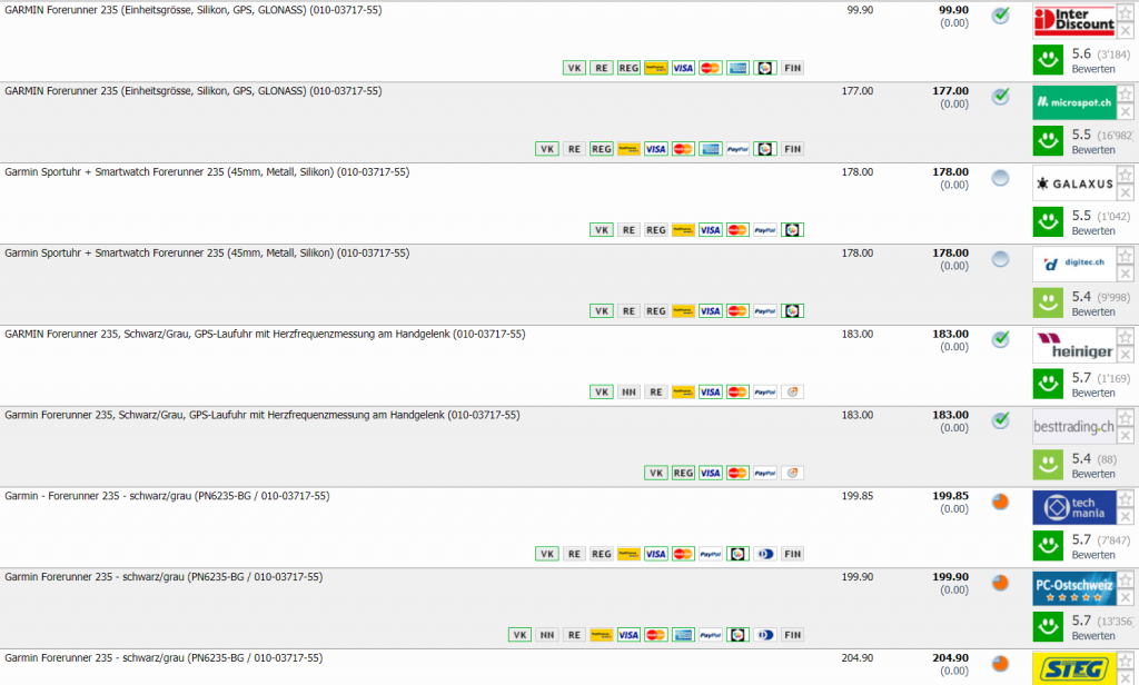 Neuer Bestpreis für die Garmin Forerunner 235 Sportuhr: CHF 99.90 bei Interdiscount. Derzeit zweitbester Preis bei CHF 177.- Bestpreis bis jetzt war bei CHF 119.-