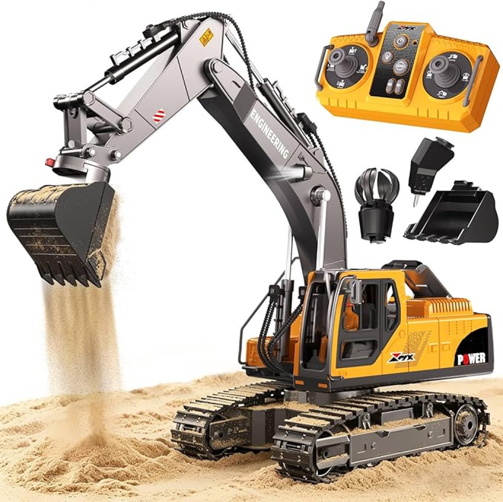 Dieses ferngesteuerte Bagger-Spielzeug bietet Kindern von 6 bis 12 Jahren eine realistische und vielseitige Spielerfahrung. Mit drei austauschbaren Metallaufsätzen – Schaufel, Brecher und Greifer – können kleine Baumeister verschiedene Aufgaben meistern und ihre Kreativität entfalten. Die 680° drehbare Kabine, authentische Motorgeräusche und LED-Scheinwerfer sorgen für ein echtes Baustellenfeeling. Dank der robusten Raupenketten ist der Bagger ideal für den Einsatz im Sandkasten, Garten oder am Strand und meistert unterschiedliche Untergründe mühelos. Zwei leistungsstarke 1200 mAh Batterien ermöglichen lange Spielzeiten, während die einfache Bedienung auch jüngeren Kindern den Einstieg erleichtert