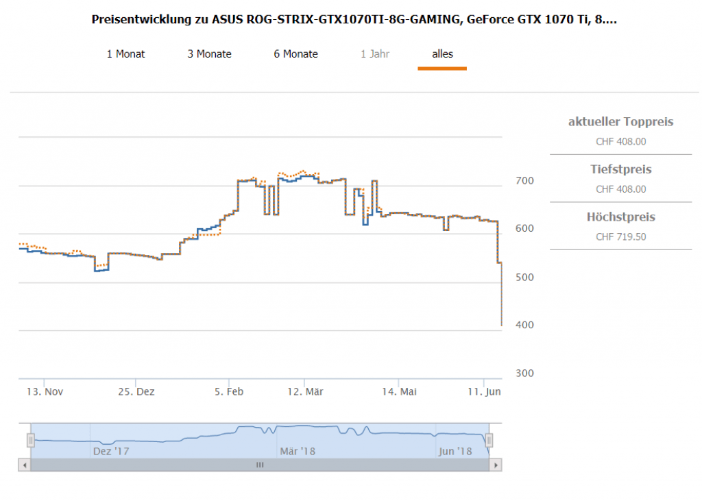 "Normalpreis" bei microspot kann ich nicht sagen, weil die CHF 408.- eine Aktion sind. Wenn du den Preisverlauf anschaust, siehst du, dass es die Karte bis heute nie irgendwo unter 500.- gab.