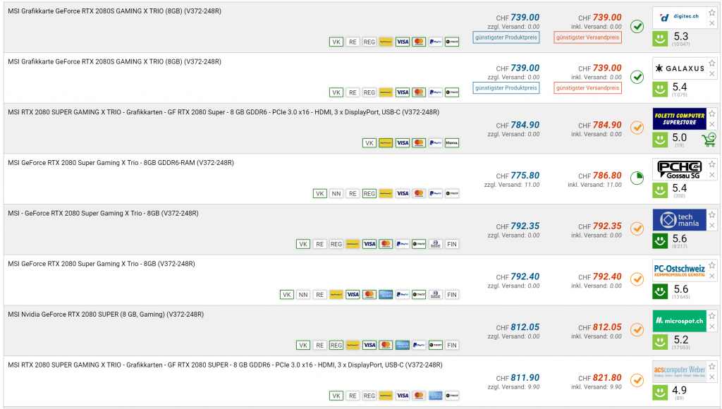 Bei Galaxus gibt’s gerade die MSI GeForce RTX 2080S GAMING X TRIO (8GB) Grafikkarte für CHF 739.- Bestpreis bisher war bei CHF 745.- Zweitbester Preis im Moment liegt bei CHF 784.90