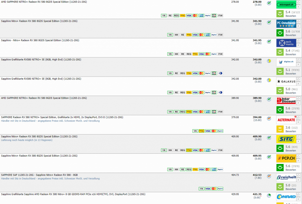 Schon wieder zum neuen Bestpreis gibt’s die Grafikkarte SAPPHIRE Radeon RX 580 Nitro+ Special Edition, Radeon RX 580, 8.0GB GDDR5. Mit dem Code GRASSD bezahlt man noch CHF 250.20 Zweitbester Preis in der Schweiz beträgt CHF 341.90. Bisher günstigster Preis lag bei CHF 276.- vor einem Monat.