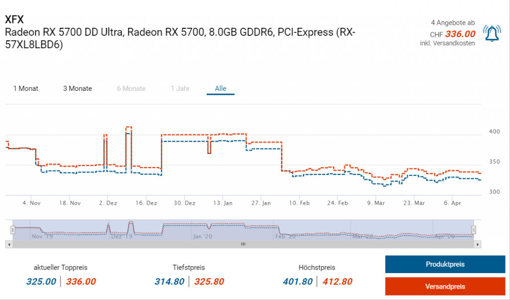Bei Amazon gibts eine weitere Version der RX5700 zum guten Preis. Der tiefstgemessene Preis für dieses Modell lag laut toppreise bei ca. 326 Franken, zurzeit kostet sie aber 336 Franken auf dem Schweizer Markt.