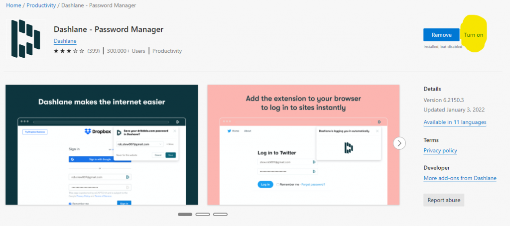 4.) Dashlane browser extension deaktivieren (wenn aktiv)