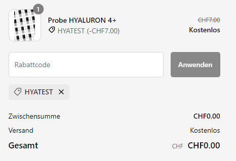 Aktuell könnt ihr euch bei ELYAH eine gratis Hyaluron 4+ Probepackung mit kostenlosem Versand sichern. Dazu einfach den Gutscheincode “HYATEST” an der Kasse eintragen.
