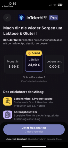 Im App Store gibt es gerade die App „InTolerApp Histamin & Fructose 12+ Histaminintoleranz & Allergie“ als gratis lebenslanges Abo.