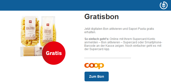 Bei mir hat's gerade eine gratis "Betty Bossi Trockensuppe nach Wahl" in der Supercard app, gültig bis 20. Dez. Will jemand mit Pasta tauschen? hahaha :-)